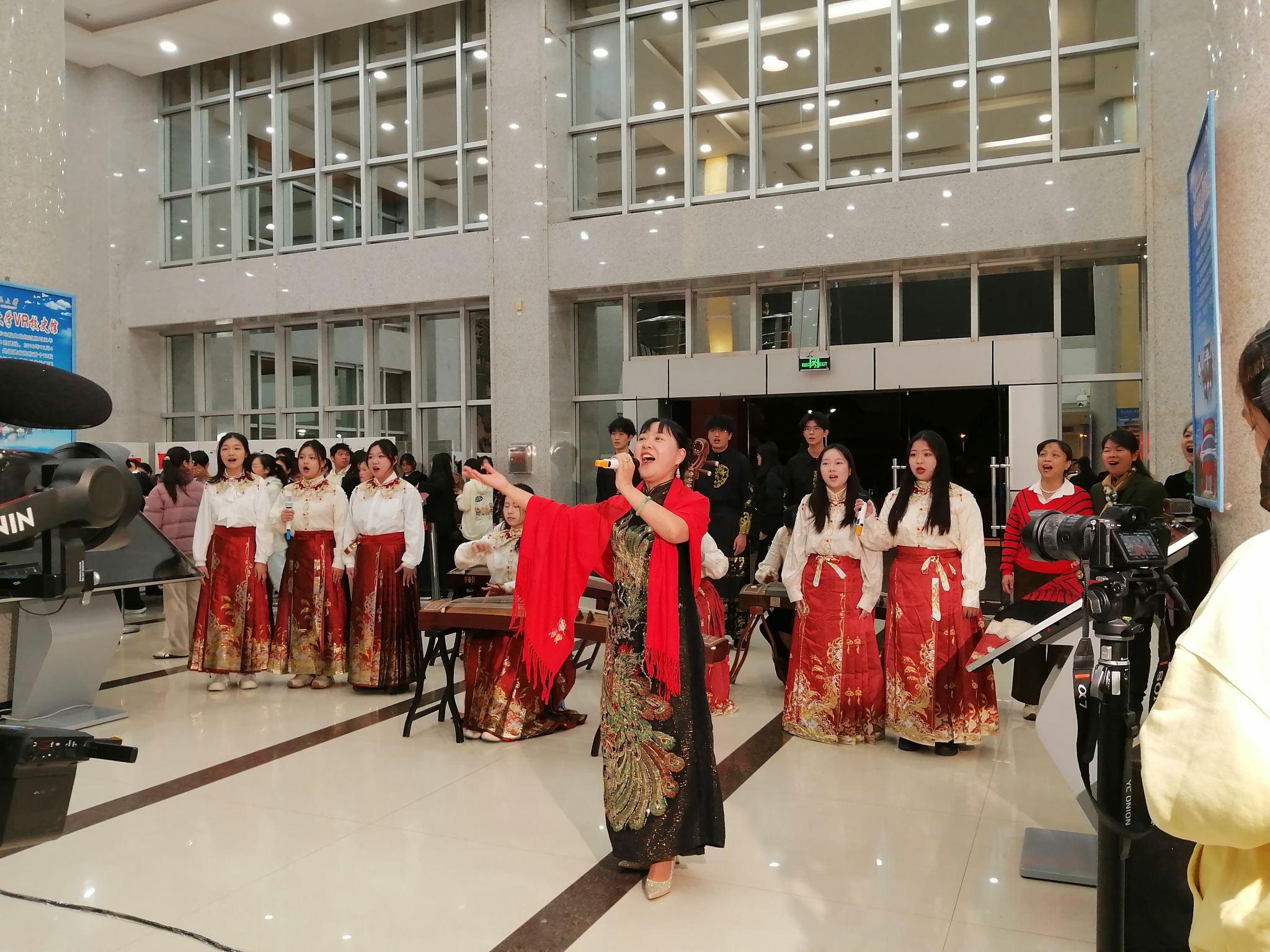 在艺术表演区,来自艺术学院的师生和来自校内各部门的文艺爱好者们为大家带来了器乐演奏与歌唱表演。在古筝、琵琶等中国传统乐器的伴奏下,《我的祖国》《明天会更好》等歌曲响彻大厅,传递出闽南师大人对伟大祖国的深厚情感和美好祝福。