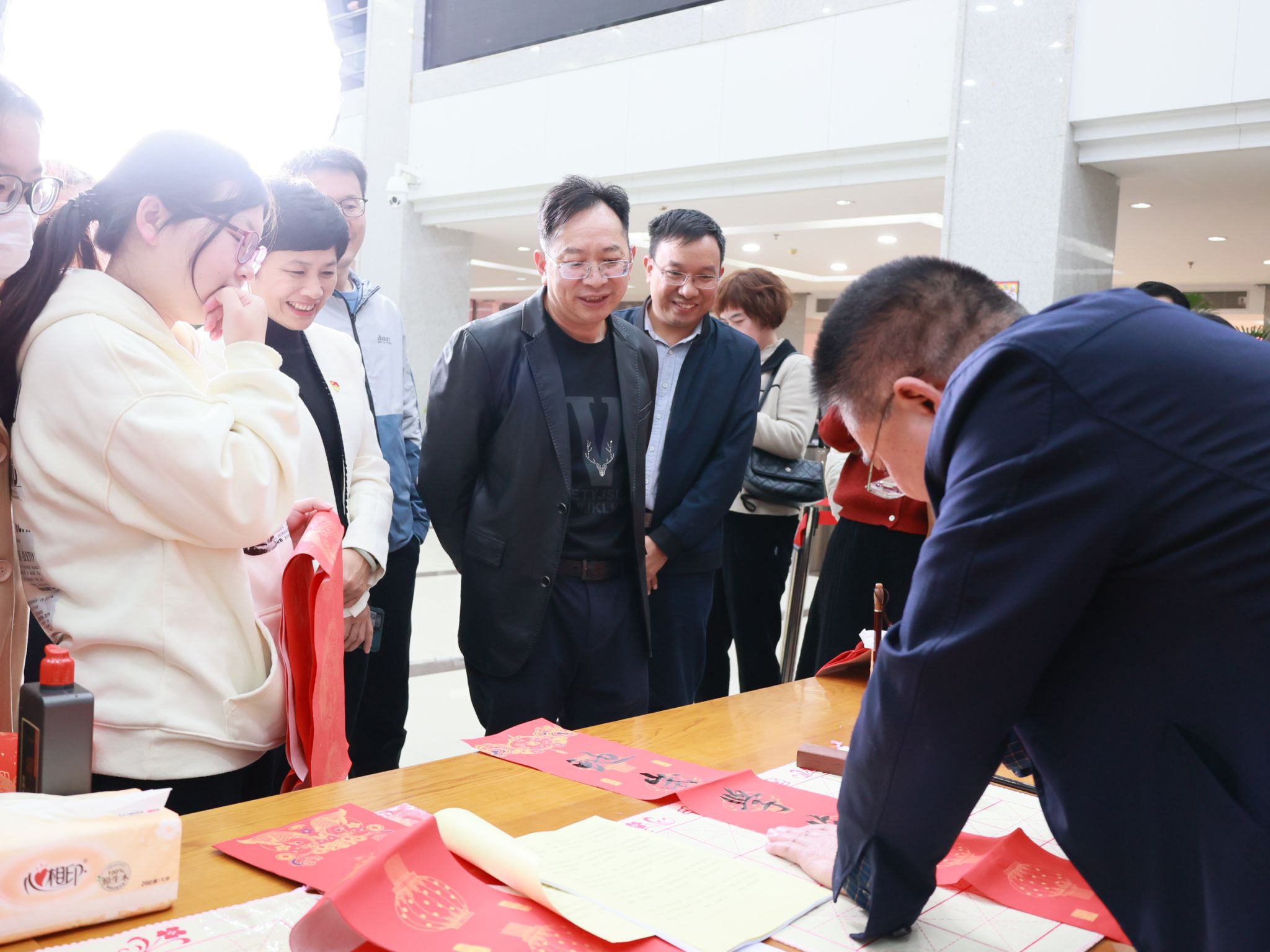 活动现场设有春联书写区和文艺表演区。在春联书写区,书法爱好者和老师们挥毫泼墨,笔走龙蛇,数百张包含着美好寓意和新年愿望的春联在他们笔下诞生,展现了中华优秀传统文化的独特魅力。