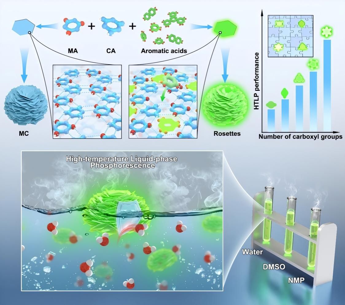 该研究通过超分子多价组装策略构建了一系列微纳结构的材料用于固定有机磷光体。实验证明,该系列材料可以在200℃左右的高温中稳定存在,并实现优异的高温液相磷光(HTLP)发射。因此,该研究为在恶劣条件下实现稳健的磷光发射提供了一种先进策略。