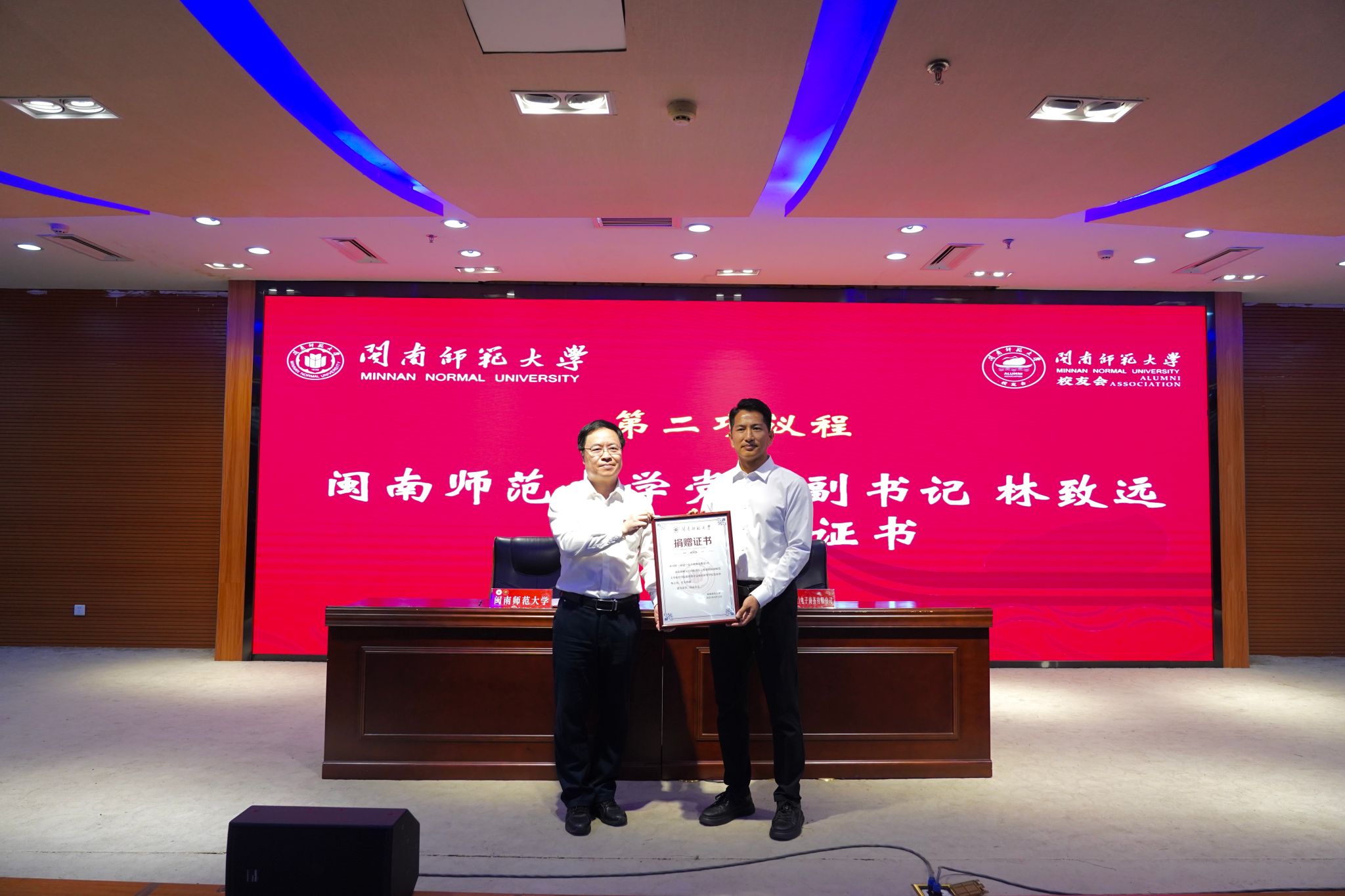 林致远作总结讲话。他高度肯定了“好老师”们以“四有”为尺丈量育人初心,在不同岗位担当育人使命的奉献精神,对福建道诚集团有限公司和亦可鲜(福建)电子商务有限公司倾情捐资、反哺母校表示感谢。他表示,学校基金会的设立为广大校友搭建起回馈母校的优质平台,是凝聚校友力量,强化校友与母校情感的桥梁纽带,让校友切实参与母校发展,意义非凡。希望校友会完善建强校友生态圈,通过深化校企合作、打造品牌活动实现校友与母校协同发展。