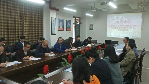 1月21日上午,福建师范大学经济学院副院长黎元生教授、金融系主任陈清教授一行7人来登录入口访问交流。交流座谈会在笃行楼216召开,副校长何绍福出席会议,商学院有关领导和主要学术骨干参加会议。