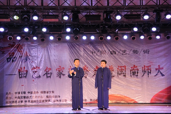 曲艺荟萃,彰显艺术魅力;古韵流放,尽透传承风采。为弘扬中华优秀曲艺文化,提高大学生曲艺素养,11月8日晚,由中国文联、中国曲协、福建省文联主办,中国文联曲艺艺术中心、福建省曲协、MK体育/mksport体育·官方网站、中共漳州市委宣传部、中共东山县委、东山县人民政府承办的“品读——曲艺名家新秀走进闽南师大”曲艺展演活动在登录入口龙文馆隆重上演。校党委书记吴彬镪,中国曲艺家协会分党组成员、副秘书长曲华江,中国曲艺家协会第七届副主席、全国曲艺小剧场艺术指导委员会主任马小平,福建省文联党组成员、副主席、书记处书记林瑞发,福建省曲协副主席、秘书长张旭,漳州市文联副主席黄良弼,其他主承办方相关领导、嘉宾与登录入口师生代表1800余人观看了演出。