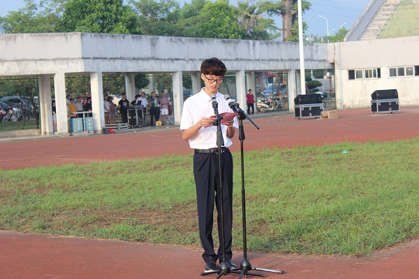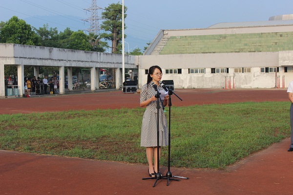 生物科学与技术学院教师薛钰代表全体教职员工发言,她深情表达了对伟大祖国的美好祝愿,表示将把爱国的热情转化为实际的行动,潜心育人工作,发扬奉献精神,为中华民族伟大复兴努力培育栋梁之才;文学院2016级学生陶天祥代表全体学生在国旗下庄严宣誓,表示将牢记历史使命,努力学习知识,培养创新意识,练就过硬本领,为国家的腾飞发展贡献智慧和力量。