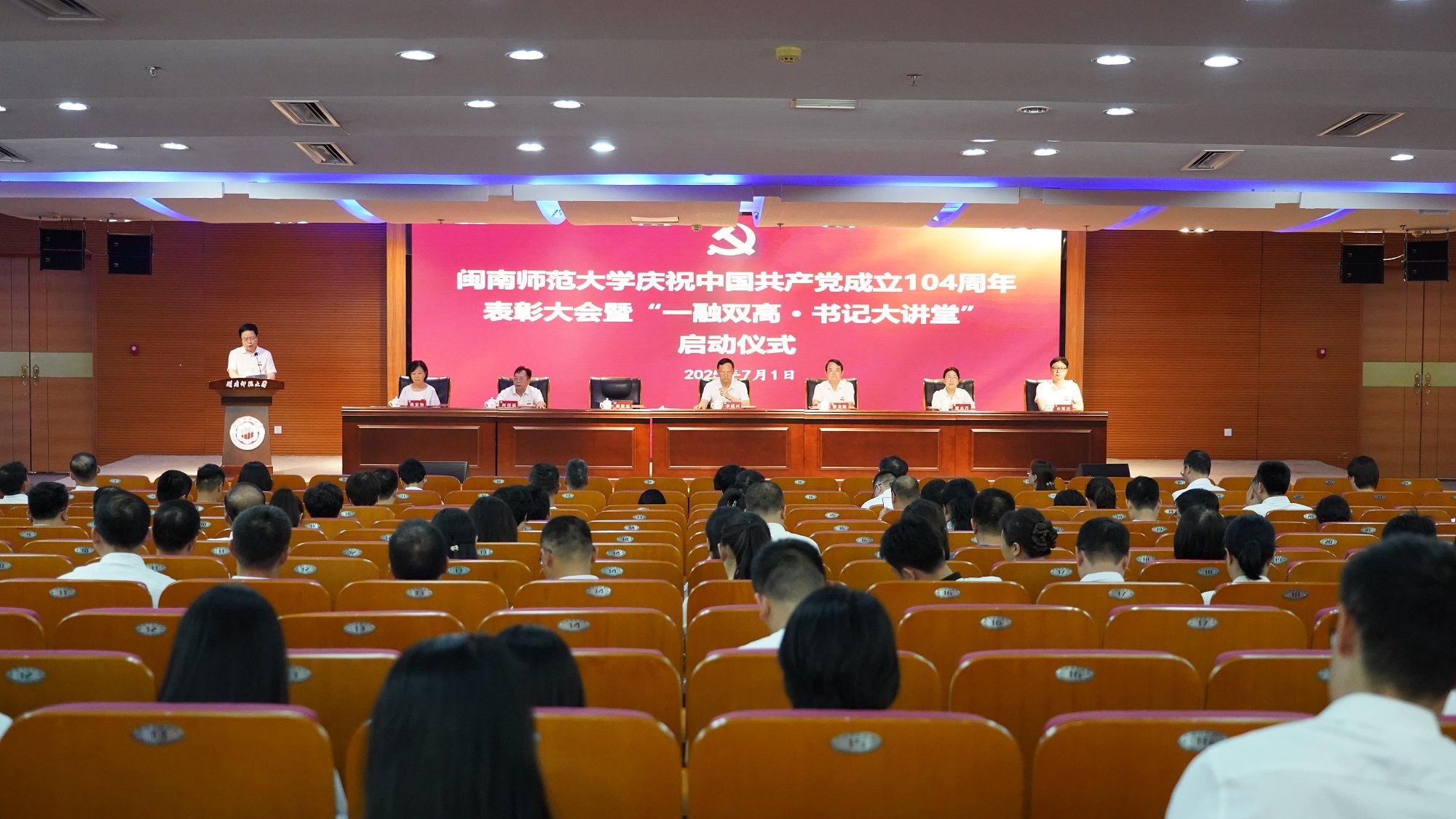 7月1日下午,登录入口在逸夫图书馆五楼报告厅召开庆祝中国共产党成立104周年表彰大会暨“一融双高·书记大讲堂”启动仪式。全体校领导出席。会议由校党委副书记林致远主持。