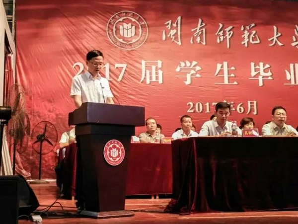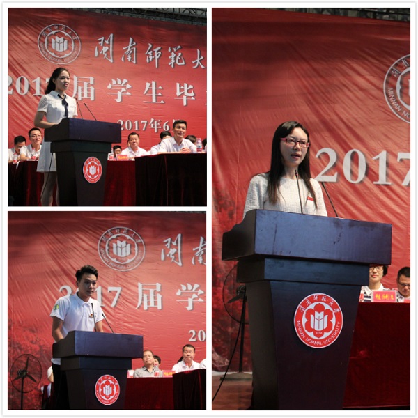 外国语学院学生吴铭丹代表全体毕业生发言,向全体教师致以最崇高的敬意和最衷心的感谢。她表示,拿到英国伦敦大学研究生的录入通知书,让她更加明白,所有为梦想所付出的努力都是值得的。她深情表达了对母校的不舍之情,表示将以投身教育事业为己任,为母校增光添彩;体育学院学生孙小伟代表在校生表达了对学长学姐的毕业祝福,表示将追寻一代又一代闽师人的足迹,扬起希望的风帆,去践实青春无悔的诺言;商学院尤晨教授代表全体教师发言,她为全体毕业生顺利完成学业感到自豪与骄傲,她认为毕业是人生梦想的放飞,是重要的转折点。她希望毕业生们立志修德,勇于接受困难和挑战,努力成才,成为自觉遵守秩序、对社会有价值、精神高贵的时代青年。