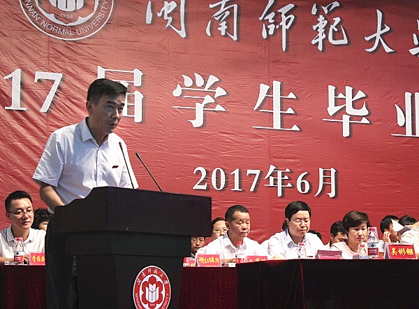 在热烈的掌声中,李进金校长发表了讲话,对2017届毕业生殷殷寄语。他对毕业生们圆满完成学业表示热烈的祝贺,为学校首次为毕业生授予博士学位这一重大里程碑表达了由衷的自豪。他指出,青年时代是学生们人生观、世界观、价值观形成的重要时期,基层一线是青年成长的必经阶段、是成长的重要基础。他表示,扎根一线有助于培养家国情怀、有助于锤炼意志品质、有助于增长本领才干。他希望毕业生们志存高远,永远保持昂扬向上的精神;希望毕业生能够脚踏实地,扎扎实实走好人生的路;希望毕业生能够到一线去建功立业,让青春绽放在祖国最需要的地方。李进金校长还诚挚邀请毕业生们在明年母校成立60周年之际回母校看看。