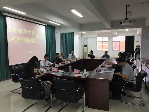 当日下午,李进金校长一行前往德化县访问泉州工艺美术职业学院,在泉州工艺美术职业学院钟发亮院长及相关人员陪同下,考察了该院的大学生文创基地、实习实践企业、学生作品展览等,并与学院党委书记邱少煌及相关部门负责人举行座谈,双方就两校进一步深化专业交流、实习实践资源共享和科技文化项目合作等问题进行了深入探讨。