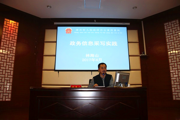 本次培训班为期两个半天。培训班邀请了漳州市人民政府办公室信息科科长林海山就“政务信息采写实践”等主题进行业务培训。林海山科长通过“研讨式”和“案例式”的讲授方法,阐述了政务信息的作用和类型,从政务信息的线索来源、撰写要求、报送渠道等方面来讲解了政务信息的采写过程和注意事项,为进一步提高培训班学员的政务信息采写能力起到了促进作用。