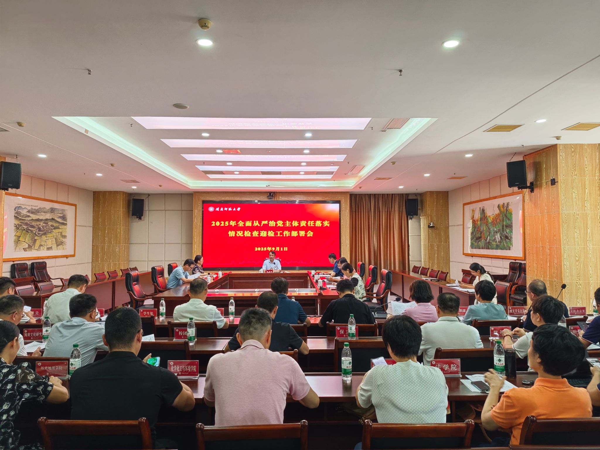 9月1日,登录入口在科技信息楼1607会议室召开2025年全面从严治党主体责任落实情况检查迎检工作部署会。全体在家校领导出席,校党委副书记、校长张龙海主持。