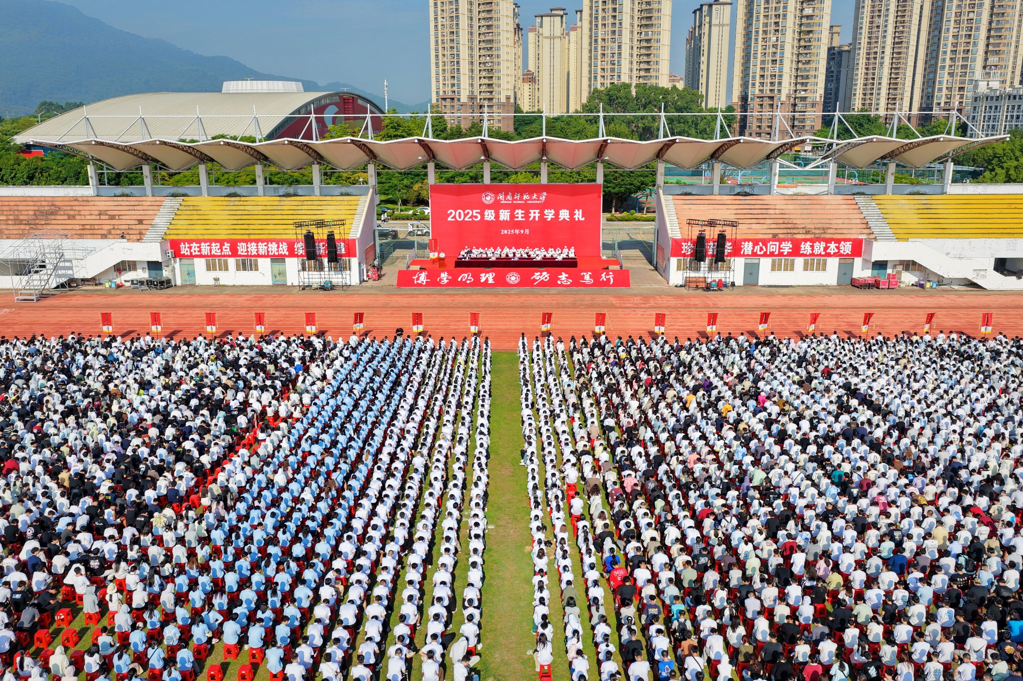 学校各机关、教辅单位主要负责人,各学院党政主要负责人、教师代表、新生辅导员,5500多名本科新生,900多名硕士、博士新生参加开学典礼。
