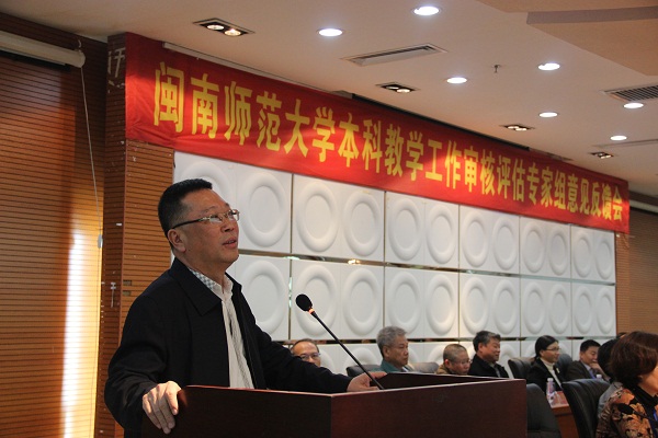 省教育厅副厅长陈国龙在会上讲话。他指出,在4天时间里,各位专家对闽南师大的办学指导思想、办学条件、人才培养、教学质量等进行了多角度、全方位、高效率的考察,对学校在本科教学工作中的成绩给予了充分肯定的同时,指出了存在的问题,提出了富有指导性的意见和建议,希望学校要认真梳理专家组的意见、建议,切实做好整改工作,明确整改任务。陈国龙副厅长要求省教育厅评估中心要全面提炼和总结专家的评估意见,尽快召开省教育厅与闽南师大的协商会;省教育厅高教处要认真研究评估意见,制定支持闽南师大改革发展的政策措施。他希望闽南师大师生能进一步解放思想、改革创新,敢于突破制约学校发展的瓶颈问题,完善体制机制,扶优扶强,突出传统优势学科,坚持开放办学,服务福建发展再上新台阶;希望学校以此次评估为契机,扎实做好“十三五”发展规划,按照“补短板、抓内涵、促特色、树品牌”的要求,不断提升教育教学质量,促进学校又好又快发展。