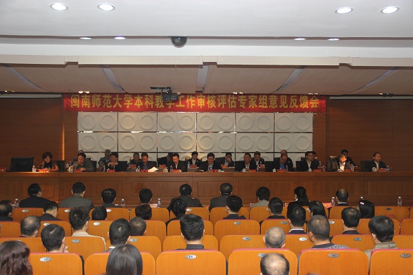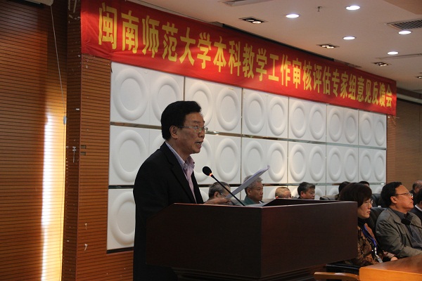 会上,专家组组长赵彬教授首先介绍了本次评估工作开展的情况。在本次审核评估中,专家组共听课、看课76节(次);走访全部二级学院(系),走访24个职能部门、5个校外实践基地;深度访谈校领导、二级学院和职能部门负责人128人(次),与师生代表、督导员等座谈36次;调阅62门课程、54个专业的试卷及1504份毕业设计(论文)。专家组还集体考察了新闻学院实验教学中心、物信学院实验教学中心、化学省级实验教学示范中心、现代分离分析科学与技术省重点实验室和福建省菌类活性物质工程技术中心,参观了教师教育成果展、闽南文化特色展、创新创业成果展及大学生创业孵化基地等。