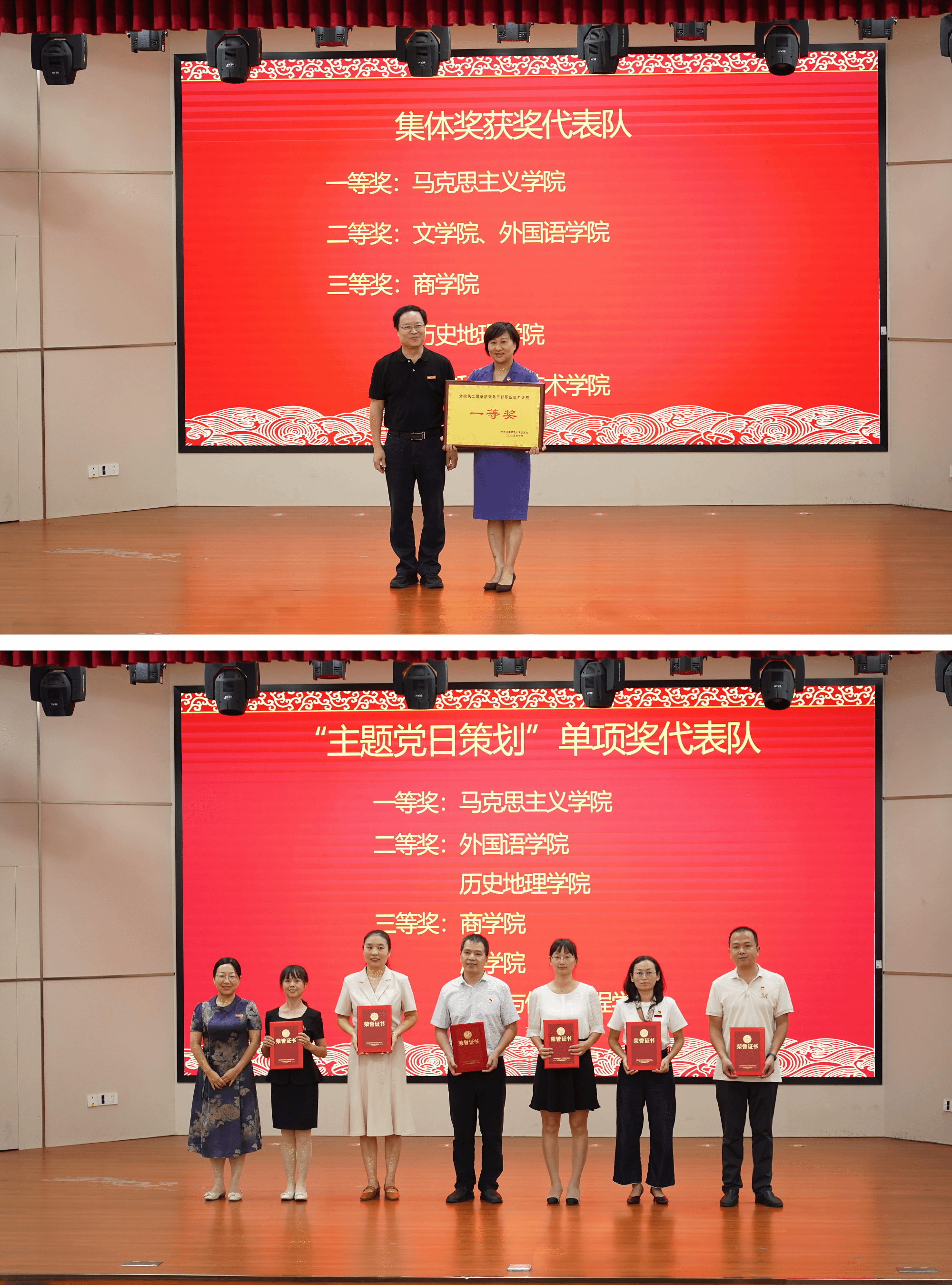 大赛设党务知识测试、主题党日活动策划、微党课展示和谈心谈话四个环节,共有15支二级学院代表队参赛。比赛现场,选手代表紧扣“建设教育强国”主题展示微党课,模拟真实工作场景开展谈心谈话,展现出扎实的理论功底与教学表达能力,体现了良好的沟通技巧与群众工作能力。经综合评审,团体赛及各环节分别评选出一等奖1名,二等奖2名,三等奖3名,林致远、廖志丹为获奖集体与个人颁发证书。