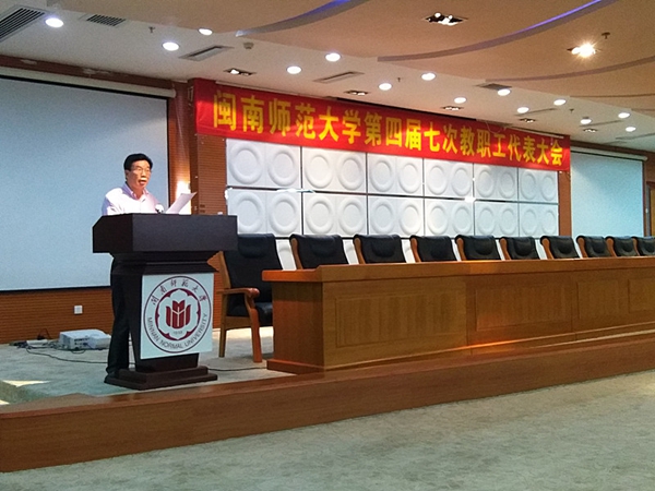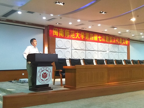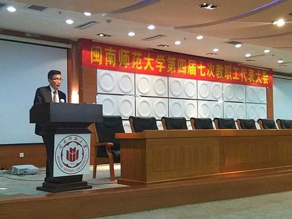校长李进金向与会代表做了题为《统筹规划谋长远、深化改革强内涵,奋力推进学校“十三五”科学发展》的工作报告,他从十个方面对学校2015-2016学年主要工作情况进行了梳理和总结。他强调,过去一年是全面总结“十二五”发展成绩、全面谋划“十三五”发展的关键一年,也是攻坚克难全面深化改革、全力迎接教育部本科教学工作审核评估的重要一年。这一年来,在学校党委的坚强领导下,学校各单位团结带领全校师生员工认真贯彻落实“四个全面”战略布局和“五大发展理念”,坚持和完善党委领导下的校长负责制,全面改进作风,深化综合改革,规划“十三五”发展,拓展办学空间,推动学校各项事业实现了新发展、取得了新成就。同时,他也指出学校发展还存在许多不足之处,发展的步伐与省内其他重点高校还存在很大的差距,学校发展面临的挑战和机遇并存,改革发展任务任重而道远。全校教职工要进一步改进作风、完善制度,更加统一思想,振奋精神,改革创新,攻坚克难。