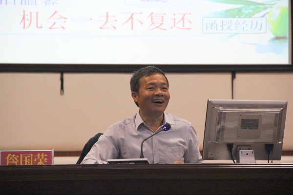 詹国荣校友从大学期间的勤奋学习、毕业后的从教爱教、担任校长期间的学校管理和团队科研的经历向在场师生阐释了“脚踏实地做好本职工作,执着追求更加卓越业绩”的重要性。他告诫在场学生,要珍惜时光、业趣统一、吃得了苦,要“养学”、会“吃亏”,这样才能为个人的长远发展打下坚实的基础。