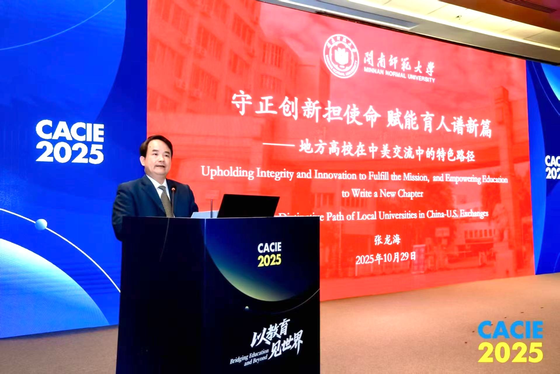 10月29日,第26届中国国际教育年会在北京国家会议中心开幕,校党委副书记、校长张龙海应邀出席年会和系列论坛,并在平行论坛“第六届中美省州大学校长论坛”上作主旨发言。