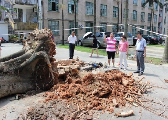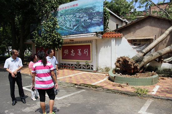 刘剑津副书记查看因树木倒塌而受损的停车棚
