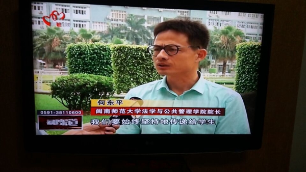 在登录入口深入推进、扎实开展“两学一做”学习教育之际,7月20日晚福建教育电视台在“先锋的力量”系列节目中,对登录入口省级优秀共产党员、法学与公共管理学院院长何东平同志进行了专题报道。在开展“两学一做”学习教育中,校党委高度重视“三个好”工作,注重从服务师生、服务社会中,“ 用身边人讲身边事,身边人讲自己事,身边事教身边人”,树立突出典型,彰显榜样示范作用。何东平同志在开展“两学一做”学习教育中,依托法律专业优势,强化社会服务,作出积极贡献,成为学做结合、服务地方的一个突出典型。他秉承着共产党员的强烈使命和对法律的忠诚信念,为弱势群体撑起法律的一片天空:建立了漳州市第一个法律援助派出高校工作站;组织法管院大学生在长泰、漳浦、平和等县区20余所中小学开展“普法情景剧”展演活动,送法进校园;组织法管院大学生前往东山乡镇进行驻村法治宣传,送法进乡村等等,用实际行动服务地方法治建设,践行了一名共产党员全心全意为人民服务的宗旨,充分体现了一名共产党员的先锋模范作用。