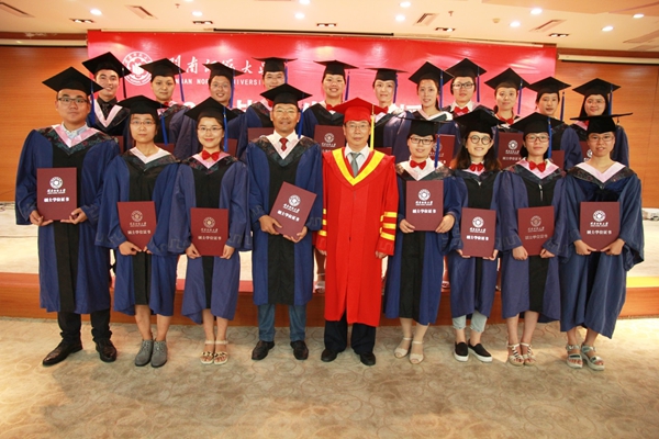 李校长代表学校对获得硕士学位的毕业生表示热烈祝贺。随后,毕业生们身着硕士学位服依次走上台,向李校长鞠躬致意。李校长缓缓将其流苏从学位帽右侧拨至左侧,为他们拨穗、正冠、授予硕士学位证书并合影留念。学位授予仪式在毕业生们热烈的掌声中结束,掌声经久不息,久久回荡在现场。