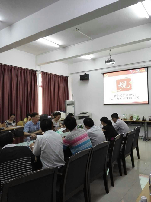 6月22日下午,副校长李顺兴同志以《坚守纪律底线,做讲规矩有纪律的合格党员》为主题,在创业楼112室为教务处党支部,外国语学院、艺术学院各一教工党支部党员讲授“两学一做”专题党课,党课由教务处处长、党支部书记林梦雷同志主持。