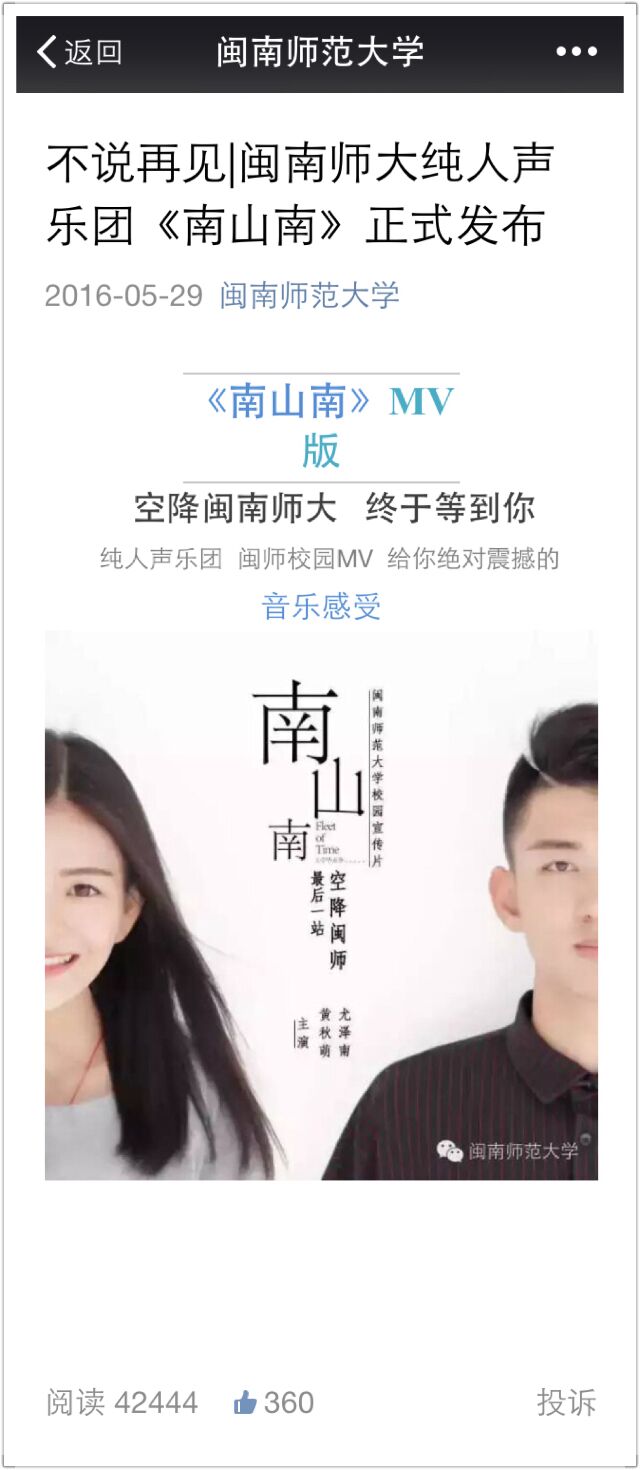 5月29日晚8点35分,一条题为“不说再见|闽南师大纯人声乐团《南山南》正式发布”的推文由MK体育/mksport体育·官方网站校官方微信运行中心推出后,短时间内迅速刷爆微信朋友圈,并在腾讯视频、bilibili官网上走红,引发热烈反响。该宣传片由MK体育/mksport体育·官方网站党委宣传部出品,闽南师大师生自编、自导、自演、自唱,截止目前,阅读量达42444次,点赞数达360个,创官方微信推送阅读量新高。官方微博阅读量31000,被在校生、校友、辅导员、毕业生疯转。