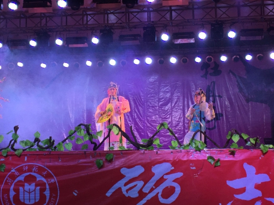 活动首先由邱煜焜老师致辞,邱老师向现场观众阐述了东西方戏曲的差异和中国戏曲的传承与发展。之后,晚会在《牡丹亭》中正式开始。《牡丹亭》作为汤显祖的代表作品,它不但为中国历代人民所喜爱,而且已传播到英、日、德、俄等很多国家,被视为世界戏剧艺术。紧接着登录入口戏曲协会上演了《牡丹亭》全剧的第十出《惊梦》的前半部分《游园》,演员们生动的表演,唱出了顾影自怜的少女复杂心情。厦门芳草越剧团则带来了《牡丹亭—幽媾》和有第二国剧之称的《孟丽君—游上林》。北师大海沧附属学校表演的《贵妃醉酒》则用别样的表演形式征服全场观众。最后则以一曲精彩的《牡丹亭—打救丽娘得重生》结束了第一部分的表演。