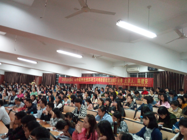 陈建安副会长结合自身丰富的司法实践经验,以独特的学术视角和深厚的学术积淀,为在场人员讲授了1979年和1997年刑法典的修订与特点,揭示出刑法的发展是历史的必然性,顺应了社会发展。讲座中,陈副会长还深入剖析我国刑法发展的状况,从刑法的设立与修改谈及反革命罪和投机倒把罪的生动案例。可见,如何进行刑法修改使其更加完善对我国刑法的丰富和发展具有重要的意义。整场讲座座无虚席,陈副会长在讲座中语言朴实、风趣幽默、案例丰富,深受与会师生好评。