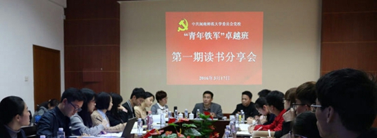 3月17日下午,校党校“青年铁军”卓越班在达理活动中心三楼校团委会议室举办第一期读书分享会。校党委副书记、党校校长吴彬镪、本次试点班带班教师及22名学员参加了读书分享会。分享会由校党委宣传部部长、党校副校长罗炎成主持。