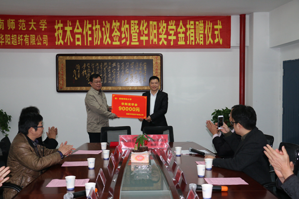 仪式上,化学学院高飞副院长与华阳超纤孙灿总经理分别代表双方签订了合作协议,肖庆伟副校长代表登录入口接受了华阳超纤孙元华董事长的奖学金捐赠。肖庆伟副校长对双方成功合作表示祝贺,对华阳超纤有限公司的奖学金捐赠表示感谢,希望双方能深入开展校企合作,充分发挥各自优势,就实现在分析检测、人才培养、产品研发与创新等方面协调发展,实现共赢。