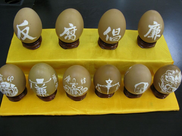 整套作品以“反腐倡廉”为主题,紧扣一个“廉”字。上排四个蛋壳正面刻有“反腐倡廉”四个显赫的大字,后面则是“梅、兰、竹、菊”四君子图,寓意为官清廉者必须恪守“四君子”的精神,不被世俗吸引,而迷失本性。下方6个蛋壳则分别寓意为官者应:“手持廉印,心系廉结,心如莲洁,公平公正,敬仰领袖,为官清廉”从多个方面深刻阐述了“廉”的重要意义,倡导“廉政为民”。