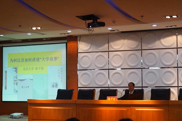 陈平原教授首先谈到,好的大学是一个有趣的地方、一个有故事可以讲述的地方,向大家介绍了一些讲述“大学故事”的散文、随笔和史著,譬如《哈佛琐记》、《哈德堡语丝》、《耶鲁潜学集》及《我的哈佛岁月》等,他自己也曾写过关于北大的《老北大的故事》一书,并颇受好评。随后,陈教授讲述了文学史视野中的“大学故事”,并指出其魅力在于故事往往带有理想性、更贴近民众的阅读趣味、文学教授讲述故事具有人文性、讲述方法比官方校史更有创新。陈教授认为“大学叙事”既可以是历史的、文学的,可以是官方的、民间的,也可以是开新的、怀旧的,又特别强调相对于官方校史而言,民间立场上怀旧的故事叙述更有趣生动,也更能反映和代表一所大学的信仰理念和精神气质。据此,陈教授以五四时期流传在北大的“梁簌溟的故事”和抗战时期流传在西南联大的“沈从文的故事”等逸事为例,指出“轶闻”虽有“失实”,但其魅力唯因“变形”才更显“可爱”,并藉此讲述如何辨别轶事的真伪。陈教授所写北大的故事就是立足于史实和故事之间,他以著作《筒子楼的故事》为例,表示拼接历史碎片需要众人共同挖掘和再现鲜活的历史记忆,而在这些故事中更能体现出一代学人们的精神风貌。最后,他认为讲述“大学故事”最理想的位置是在文史的夹缝中挥洒才情,既要尊重史实,更要有自己的立场和才情,方能在虚实之间游刃有余。