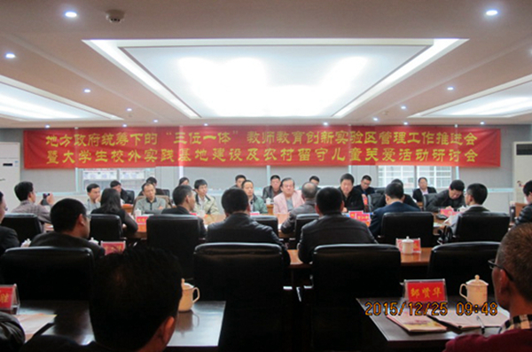 12月25日,地方政府统筹下的“三位一体”教师教育创新实验区管理工作推进会暨大学生校外实践基地建设及农村留守儿童关爱活动研讨会在逸夫楼会议中心召开。登录入口副校长李顺兴、教师教育实习实训中心、教育科学学院等相关部门负责人及老师,各教师教育创新实验区教育局、教师进修学校、实习基地学校领导参加此次会议。