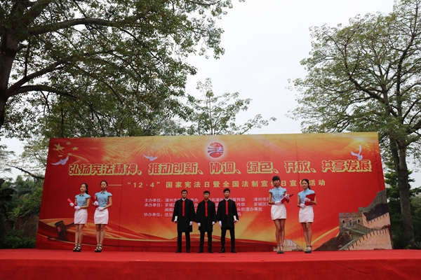 12月4日上午,由漳州市依法治市办、中共漳州市委宣传部、漳州市司法局主办,芗城区依法治区办、中共芗城区委宣传部、芗城区司法局、闽南师大法学与公共管理学院、东铺头街道办事处等单位共同承办的12·4全国法制宣传日宣传活动在中山公园顺利开展。此次宣传活动的主题为“弘扬宪法精神,推动创新、协调、绿色、开放、共享发展”。漳州市委常委、政法委书记刘文标、市人大副主任黄双庆、市政协副主席林俊山、MK体育/mksport体育·官方网站副校长蒋一婷、法学与公共管理学院领导等莅临宣传活动现场。