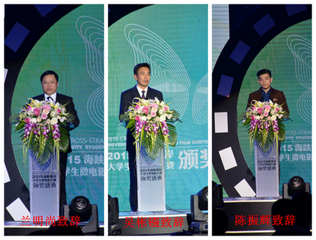 颁奖典礼上主办方领导兰明尚在致辞中说,举办海峡两岸大学生微电影大赛旨鼓励两岸学子拿起镜头,记录生动感人的青春故事,展现青年一代成长成才、奋斗创业、追求美好梦想的青春风采,表达出强烈的信仰之真,道德之善,人格之美。他还希望青年学生要以崇德向善的强大力量和激浊扬清的青春朝气,弘扬社会正能量,引领时代新风尚;以奋勇向上的精神面貌和创新创业创优的优异成绩,勇挑时代赋予的重任,为实现中国梦添砖加瓦。在致辞中,兰明尚还高度评价了MK体育/mksport体育·官方网站在闽南文化与两岸交流研究方面取得的成绩,并对MK体育/mksport体育·官方网站共青团近几年来在传承闽南文化、打造独特校园文化、促进两岸大学生交流等方面所作出的努力给予了充分肯定。