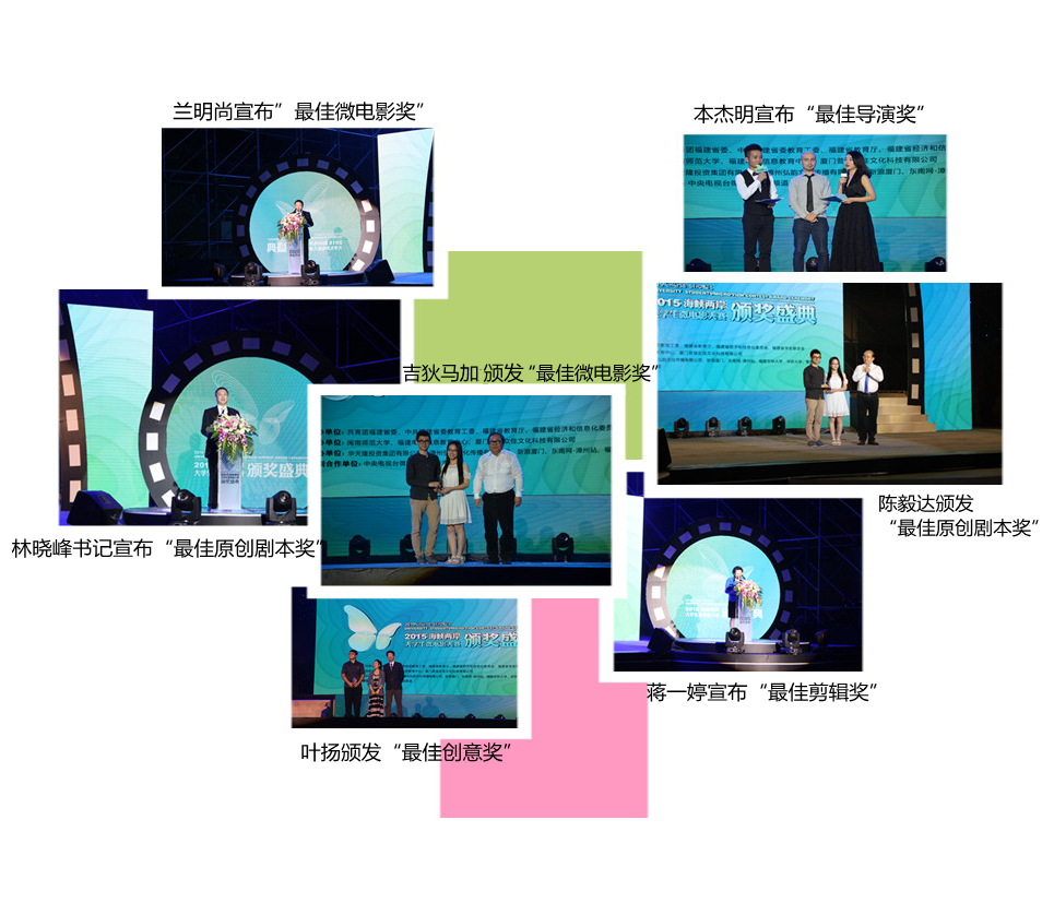 颁奖典礼仪式上先后颁发了最佳公益奖、最佳网络人气奖、最佳摄影奖、最佳剪辑奖、最佳原创剧本奖、最佳广告奖、最佳创意奖、最佳导演奖、最佳微电影奖9大类奖项,其中穿插鼓舞、舞蹈、街舞、视频互动、戏曲、木偶等表演。本届微电影大赛于今年8月底启动,历时3个多月,得到了各界人士的关注,共收到海峡两岸40所高校的217部参赛作品。经组委会评委评审,共有来自北京电影学院、厦门大学、福州大学、华侨大学、福建师范大学、MK体育/mksport体育·官方网站等大陆高校,以及台湾的世新大学、台湾艺术大学、南台科技大学等共17所高校的21部作品从中脱颖而出,入围本次微电影大赛。