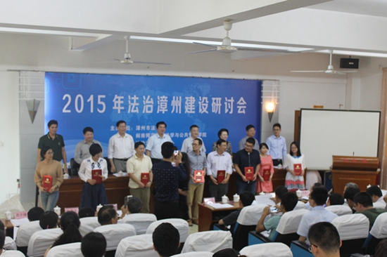 会议表彰2015年“法治漳州”建设研讨会入选论文作者。蓝潮永等6位论文作者代表在会上作交流发言。