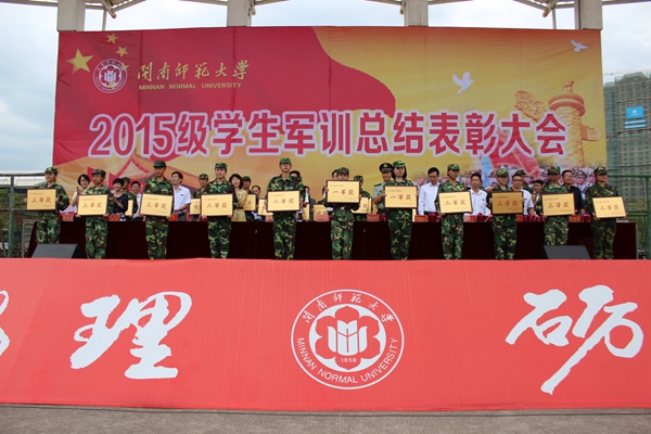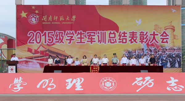 汇报表演过后,吴彬镪副书记代表学校向承训部队赠送锦旗,李顺兴副校长宣读了军训表彰决定。军、校领导为军训中涌现出的24个军训先进集体、5个军训宣传先进单位、147间先进宿舍、415名军训积极分子颁发了奖牌和荣誉证书。