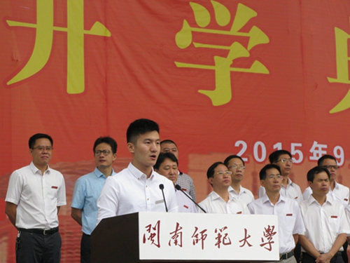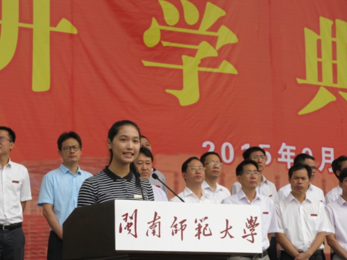 数学与统计学院张天衢同学代表全体在校学生发言,鼓励学弟学妹们积极进取,用火热的激情实现青春美好的梦想。2015级法学与公共管理学院陈宇琦同学代表全体新生,向学校师生的亲切关怀、周到服务表示感谢,号召全体新生尽快适应新生活,努力创造新业绩。