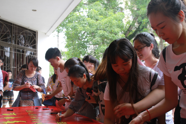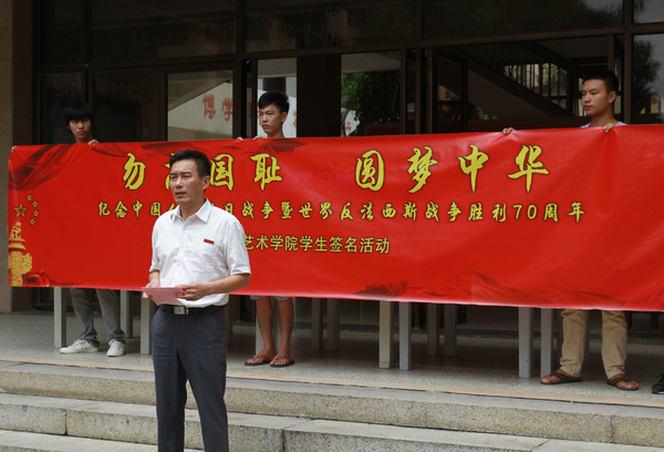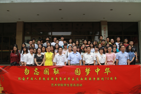 9月2日上午,由艺术学院主办的“纪念中国人民抗日战争暨世界反法西斯战争胜利70周年”主题签名仪式在艺术学院一楼举行。校党委书记林晓峰、党委副书记吴彬镪,党委宣传部、艺术学院领导,及党员及师生代表参加了仪式。