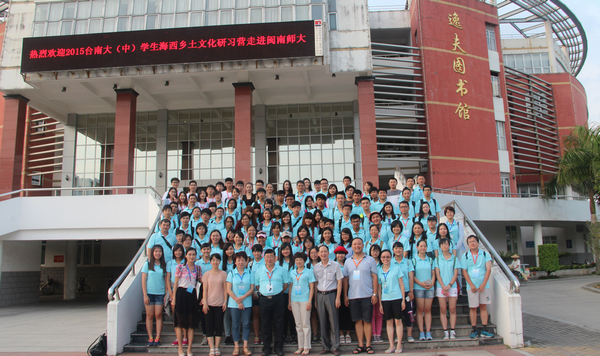 7月16日下午,“2015年台南大(中)学生海西乡土文化研习营”走进闽南师大。全体研习营成员参观了登录入口闽南文化展示馆、地方文献库和校园,并与登录入口学生进行互动。此次活动由台盟中央主办、台盟福建省委承办、台盟厦门市委会、台盟漳州市委会、厦门大学、闽南师大等单位协办,以“血脉相连•海西乡土文化之旅”为主题,旨在促进两岸文化交流,加深台湾青年学子对大陆的了解。台盟福建省委会专职副主委、本营营长柯连妹、漳州市人大常委会副主任、台盟漳州市委主委李珊珊、登录入口统战部部长欧阳红红、台南大学附属启聪学校校长管志明先生以及研习营营员及台籍志愿者83人,登录入口师生20余人参加了活动。