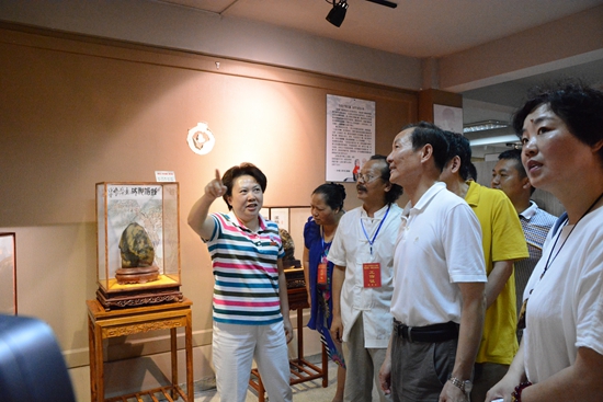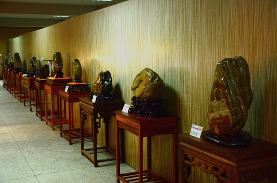 本次展示会共展出玉雕30件,天然赏石180件,分布于两个展厅。第一展厅参展华安玉赏石精品130件,分成“山水景观”、“人物器物”、“文字图案”等三个主题;第二展厅展示华安玉雕精品。玉雕《金猪》栩栩如生,可见雕刻家的技艺精湛。赏石《狮山胜景》犹如一头雄狮盘踞而成的大山,壮丽雄伟。在众多赏石中,还有一件名为《人之初》的赏石,这件赏石长、宽各16cm,高34cm,外形犹如初生的婴儿,闭眼蜷缩着。这件赏石还曾在上海世博会上获得铜奖,是收藏家蓝启源先生的藏品之一。现场多位收藏家都热情地给赏石者介绍展厅里的赏石、玉雕,为他们解疑答难。其中,收藏家庄志强先生表示,这些天然赏石是大自然赐予我们的宝物,并希望大家共同保护它们,爱护它们,把赏石文化传承下去。庄先生还表示,这次展示在闽南师大开展,让他们这些玩石者和大学师生有了一个很好的交流机会,这也是赏石文化和大学文化的一个很好的交融点。