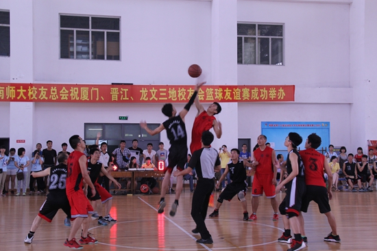 “开赛了!开赛了!多年未见的老同学又要同场争锋了!”随着一声声呐喊,5月16日,登录入口厦门、晋江、龙文校友会在综合训练馆举办篮球友谊赛, 同时在西区田径场乒乓球室举行校友乒乓球赛。本次篮球赛采取循环赛制,各校友会两两对赛。厦门校友会会长严枫、常务副会长邓敬文,晋江校友分会名誉会长黄华东、会长吴永泰,龙文校友分会会长洪立颖、副会长黄渊峻分别带队参赛。蒋一婷副校长,校友办、体育学院相关领导和老师以及部分学生到场观赛。