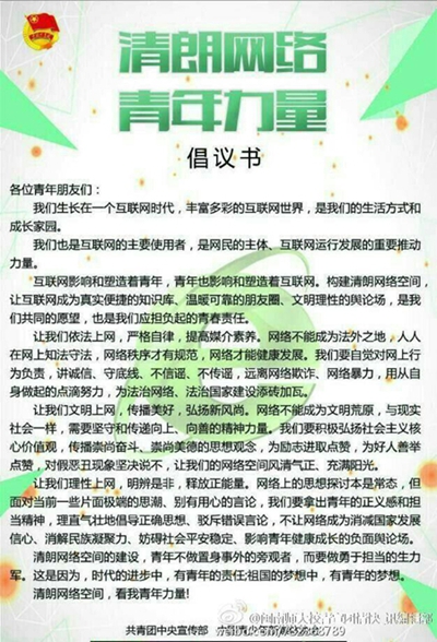 清朗网络,青年力量。校团委下属各学生组织以网络媒介的多种平台,多重主题各个方面学习八字真经,激励广大团员青年大力发扬五四精神,以奋斗实干的行动成就出彩人生。校新媒体管理中心以学习八字真经为目的开展了“我的青春梦,青春正发声”主题团日活动,其下属微博管理服务中心开展了微博共话青年节活动,以“中国好网民”和“青年节”为两大主题开展微博话题讨论,让青年学生抒发青春宣言,一天内获得近百次转发及讨论;校新媒体管理服务中心还利用微信平台向广大学生推送“大大你好,习大大与青们交心的那些话”的五四特辑,用文字激发青年之志;同时利用微信平台开展了以“弘扬大学生青春正能量”为主题的“走走走,正青春”图片征集系列活动,围绕“三走”精神,弘扬社会主义核心价值观;校青年宣传中心开展了以“大大,你听我说”和“青年,朝气蓬勃的人”等主题的微博原创话题讨论,同学们畅所欲言,引起强烈反响。
