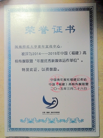 “清朗传媒·青年力量”2015年中国(福建)高校传媒联盟年度峰会于3月28日、29日在福建农林大学顺利举行,登录入口青年宣传中心荣获2014-2015年中国(福建)高校传媒联盟“年度优秀新媒体运作单位”奖。