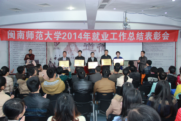 会上,党委副书记吴彬镪宣读了《关于表彰闽南师范大2013-2014学年度就业工作先进集体和先进个人的决定》,并为生物科学与技术学院、文学院、化学与环境学院、物理与信息工程学院、教育科学学院等2013-2014学年度就业工作先进集体颁发奖牌。校学生处处长林致远为就业工作优秀奖、就业工作进步奖的获奖单位颁奖,校团委副书记郑炎山为就业工作先进个人颁奖。