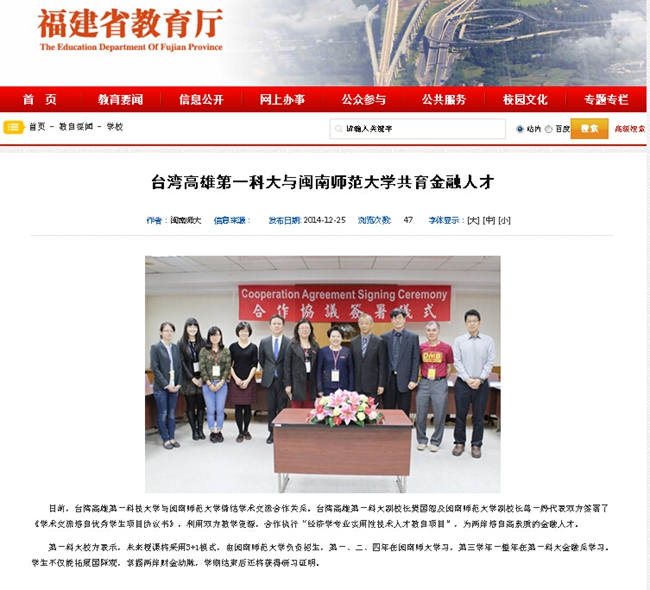 近日,福建省教育厅网站主页连续报道登录入口最近校园新闻,一则为《MK体育/mksport体育·官方网站成立公共关系与商务礼仪中心》;另一则为《台湾高雄第一科大与MK体育/mksport体育·官方网站共育金融人才》。现转刊如下: