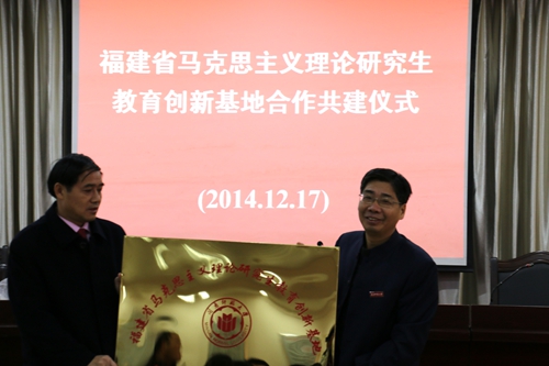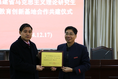 中共中央宣传部、教育部文件精神指出,马克思主义理论需要引导学生自觉走与实践相结合的成才之路。在古田会议召开85周年之际,12月17日,马克思主义学院与古田会议纪念馆合作共建福建省马克思主义理论研究生教育创新基地授牌仪式在古田会议纪念馆会议室举行。马克思主义学院院长陈再生与古田会议纪念馆馆长曾汉辉共同为创新教育基地授牌。马克思主义学院2014级全体硕士生,登录入口福建省马克思主义理论(思想政治教育)研究生教育创新基地指导教师,古田会议纪念馆胡志豪副馆长、办公室曾宪华主任参加了授牌仪式。