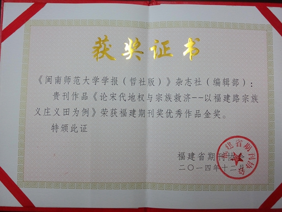 在福建省期刊协会主办的2014年“福建期刊奖”评选活动中,登录入口学报(哲社版)选送的作品《论宋代地权与宗族救济——以福建路宗族义庄义田为例》荣获优秀作品金奖。该作品由闽南文化研究院刘云副教授撰写,学报编辑王志奎编辑完成。本次“福建期刊奖”评选活动,共有180篇参评作品,其中金奖12篇,银奖20篇,铜奖25篇。
