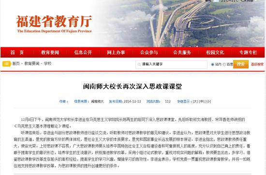 2014年12月12日,福建省教育厅网站新闻报道登录入口李进金校长再次深入思政课课堂,现全文转载如下: