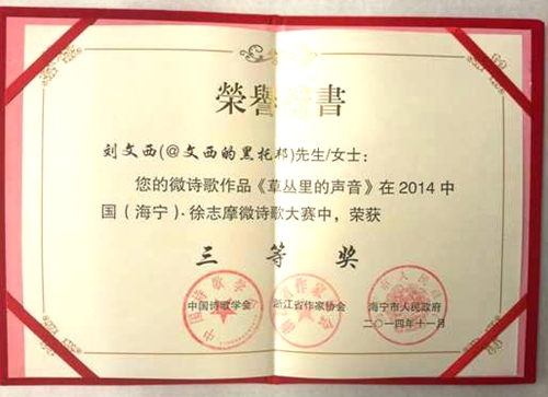 2014年11月19日,为纪念诗人徐志摩先生而创办的中国(海宁)·徐志摩微诗歌大赛落下帷幕,文学院12级刘文西同学以《草丛里声音》荣获大赛三等奖。 中国(海宁)·徐志摩微诗歌大赛前身为徐志摩诗歌奖,由中国诗歌学会、浙江省作协、海宁市人民政府,海宁文学艺术界联合会、海宁MK体育/mksport体育·官方网站等单位主办,由大卫等当代著名诗人担任评委。此次大赛共收到10072首参赛作品,最终挑选出18件获奖作品。一等奖一件,二等奖三件,三等奖四件,优秀奖十件。